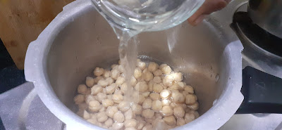 - Add Chickpeas in a Pressure Cooker and add 4 Cups of water and Cook till it gets Soft.
