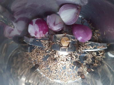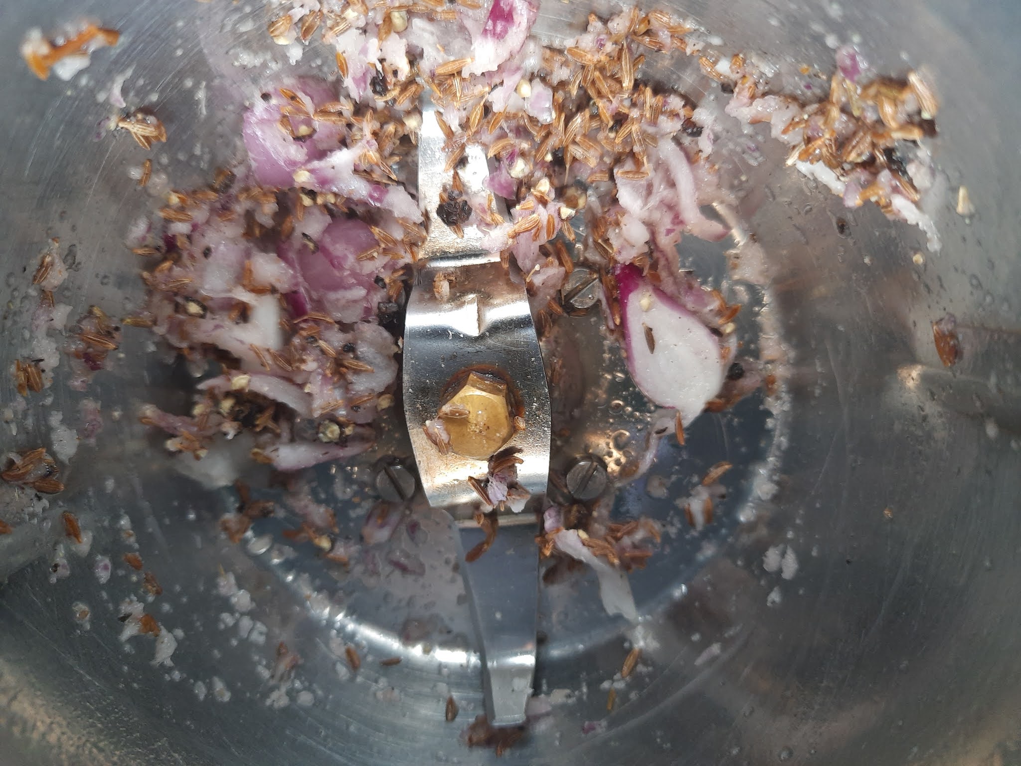 - In a blender add Onion,Cumin Seeds and Pepper Corns and blend Coarsely.