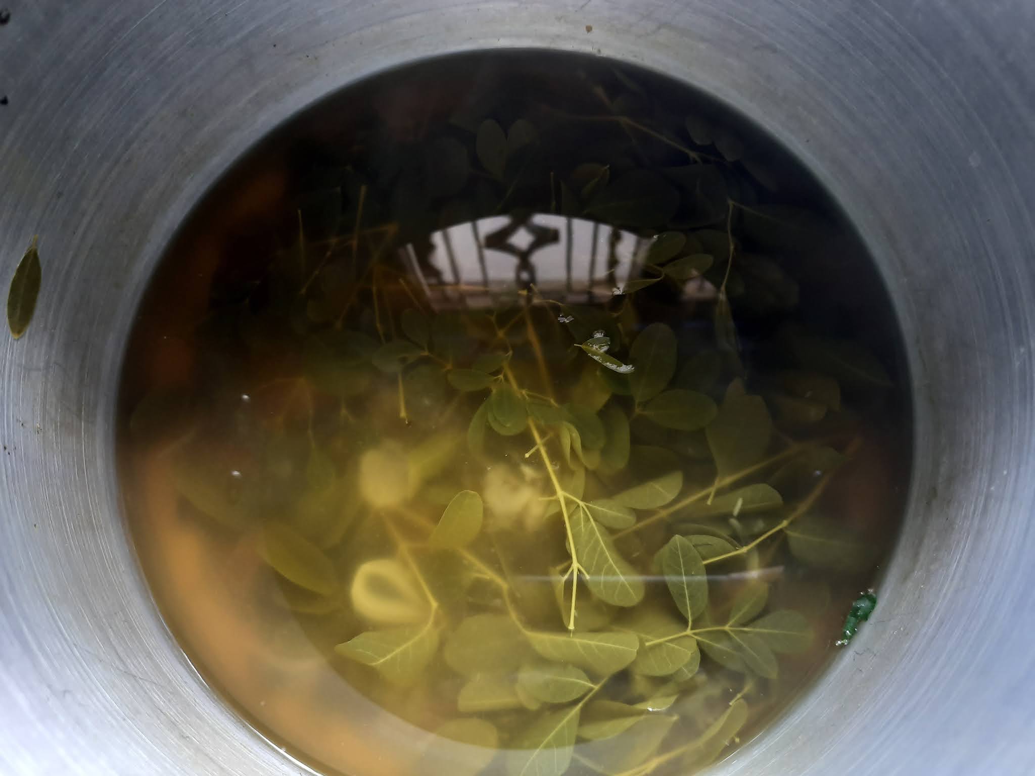 - In a Pressure Cooker add Drumstick Leaves and 2 Cups Water.