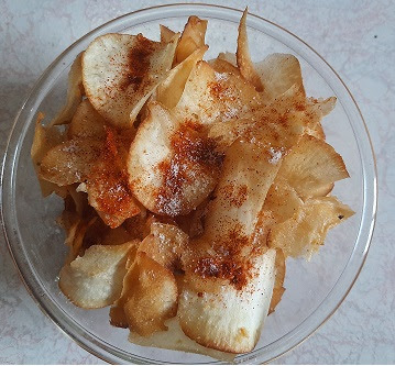 • Once it is done transfer the chips to a mixing bowl and add needed Salt and Chili Powder.