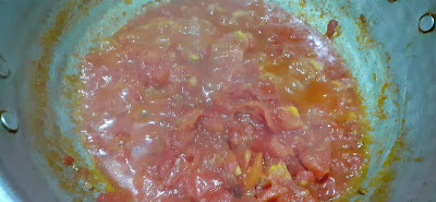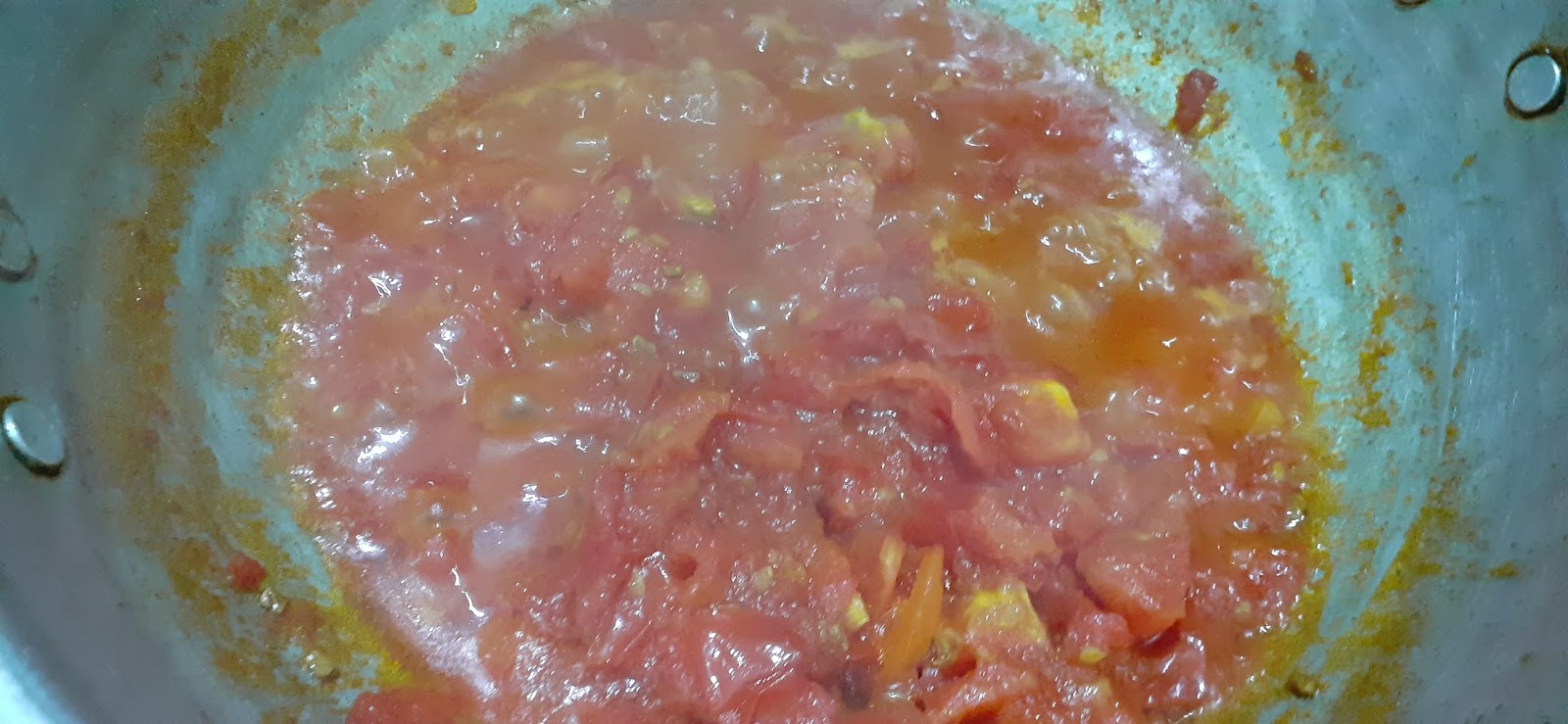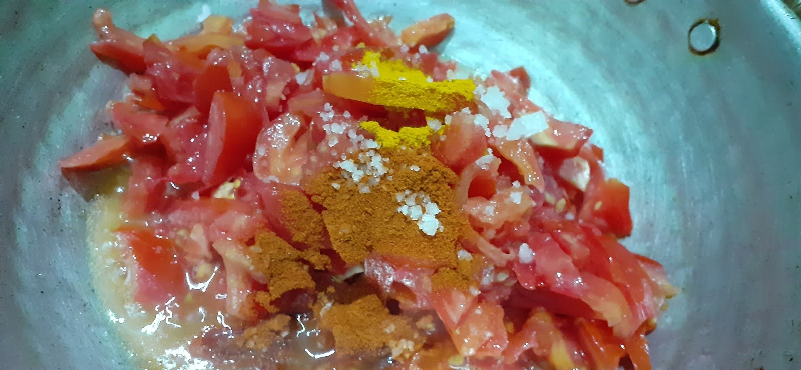 - Add in Chopped Tomatoes,Chili Powder,Turmeric Powder and Salt.