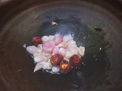 Heat a kadai and add oil.Once oil is hot add chopped Shallots,red chilies and saute till it becomes soft.